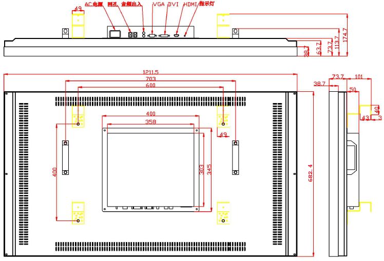 HDMI/DVI/VGA/AV/USB/RS232/ 电源接口 |